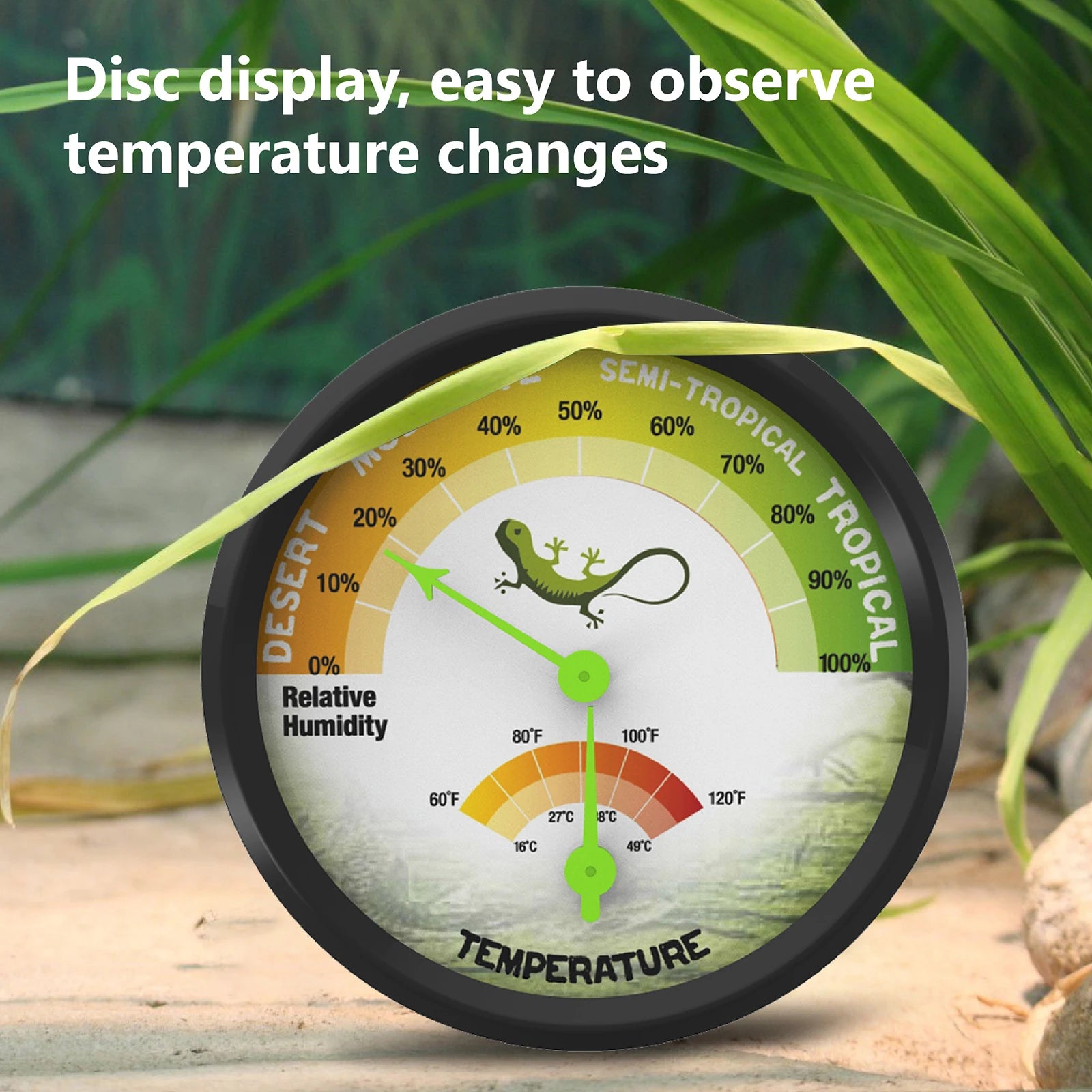 - Description: Provide precise environmental control for your pet's enclosure with our Compact Terrarium Temperature & Humidity Gauge! This robust "Climbing Pet Thermometer" is crafted from high-quality ABS, PC, and Aluminum, ensuring durability and ease of use for long-term ambient monitoring. It accurately measures temperatures ranging from 16℃ to 49℃ (60℉ to 120℉) and humidity from 0% to 100%, displayed clearly on its 74mm diameter dial. Designed for convenience, it operates without any batteries, relying on physical sensing for continuous readings. Its compact size makes it ideal for various pet habitats, including reptile tanks and terrariums. Simply use the included double-sided stickers to securely fix it in the required place, both indoors and outdoors, to create and maintain a comfortable environment for your pet.