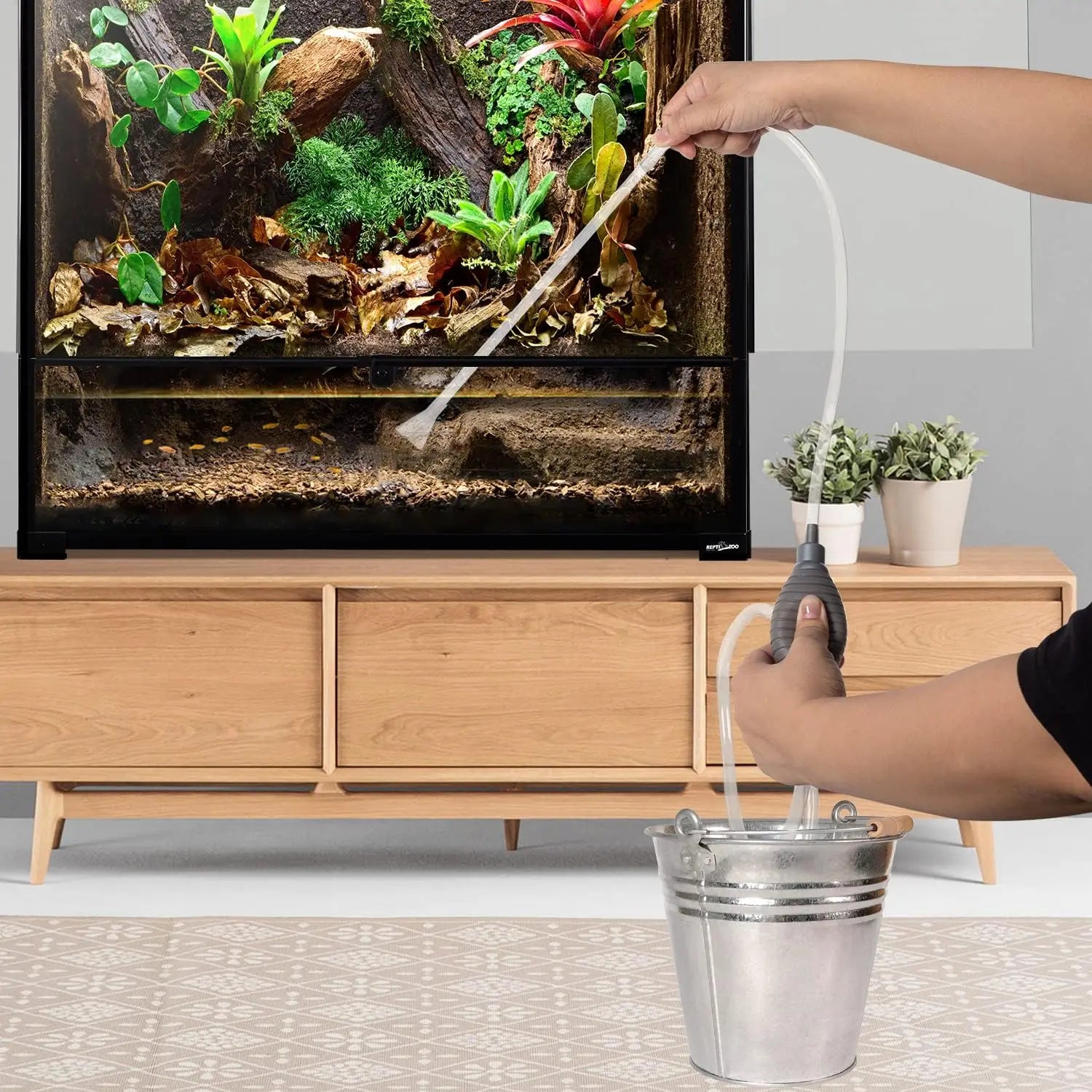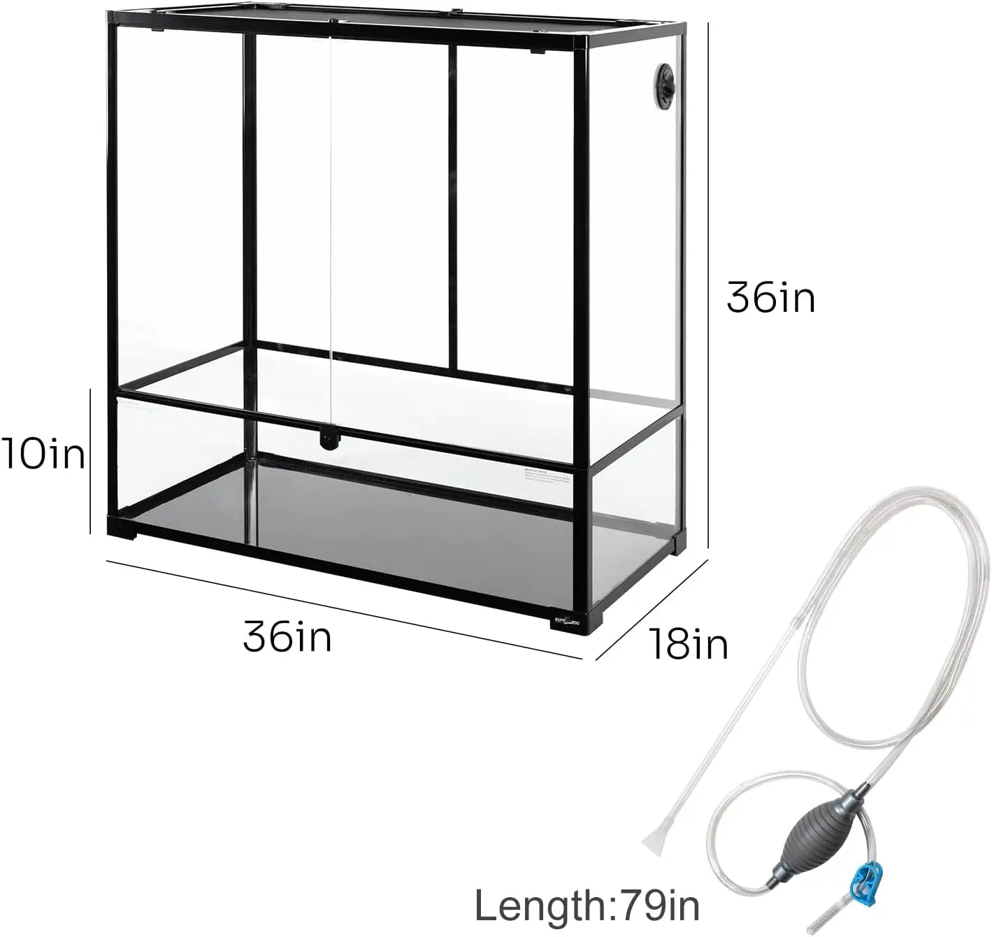 Description: Discover the ultimate habitat for your amphibian and reptile pets with our Deluxe 96-Gallon Paludarium Tank! This vertical terrarium, measuring 36”(W) x 18”(D) x 36”(H), provides vast room to build a natural tropical environment. It comes complete with a Cleaner Set, including a 72.8-inch siphon and gravel cleaner for easy, hands-free water and substrate changes. The Waterproof Bio Deep Bottom can hold water up to 10 inches deep, making it versatile for both desert terrarium and tropical tank setups, and is raised to fit a substrate heater.