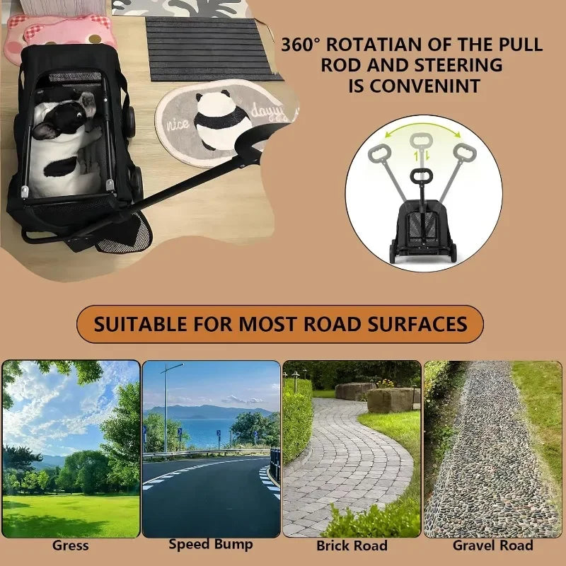 - Description: This Black Multi-Use Pet Stroller offers ultimate versatility for your small dog or cats (up to 22 lbs). It functions as a stroller, car seat, shoulder carrier, pull cart, and pet house. Made with a durable steel frame and 100% Oxford cloth, it's built to last. Features 5 breathable mesh windows for comfort, a spacious interior with washable cushions, and an easy-fold design for convenience. Includes an internal safety harness.